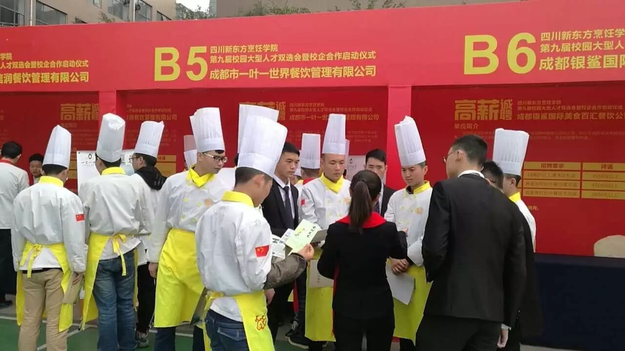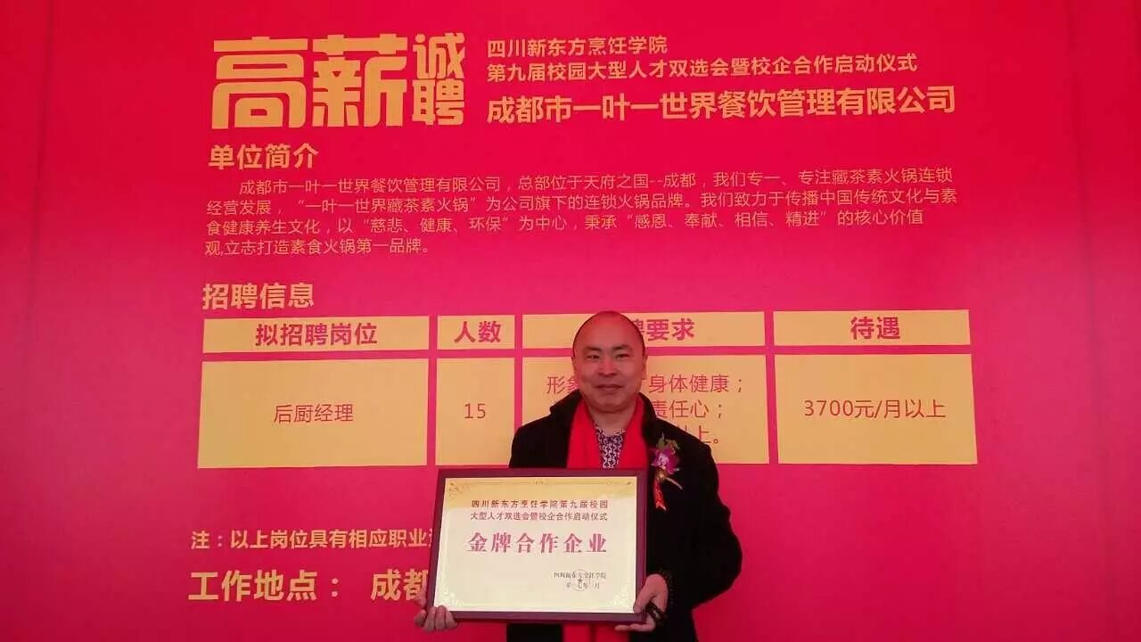 新东方双选会 | 一份福慧双收的工作,你准备好了吗?❤ 暖意三月,万物复苏,这是用人单位大力招揽人才的黄金时节,更是厨师行业求职择业的良好时机。如今的餐饮业正势如破竹成为人人掘金的黄金产业,餐饮行业对厨师技术人才的庞大需求可谓格外亮眼。 图:赵总(右二)代表一叶一世界参加启动仪式和剪裁 3月3日,第九届校园大型人才就业双选会在四川新东方烹饪学院蛟龙港校区隆重举行。一叶一世界、城市名人酒店、蜀九香等8家知名品牌作为金牌校企合作单位受邀参加了启动仪式和剪彩。 在招聘现场,场面十分火爆,有600多名即将毕业的学生参加,我们也为这些餐饮界的后辈新生提供了丰厚的薪资和发展平台。这两年素食行业的快速发展,对于素食人才更是求贤若渴。 招聘现场,公司副总赵总、人力资源部唐总监分别和学生们认真介绍了素食不仅是未来餐厅行业的主流方向,而且也会成为一种标杆;并向大家阐述了一叶一世界作为素食行业的领头羊,独创了“标准化、无油烟、无大厨、不生火”的新颖模式,颠覆了大家对于传统餐饮的印象。作为餐饮管理公司下面的连锁品牌,员工的发展空间巨大,成长与收获并存。 企划部龙总监则向大家展示了公司对于员工的人性化管理,为员工提供舒适和干净的住宿,让员工没有后顾之忧;以及刚刚举办的“首届员工餐大赛”让员工自己吃得好。 同时,专门成立了“叶余时光”,组织大家出游、拓展、爬山等户外活动,以此丰富员工的工作之余的生活;公司也为员工提供丰富的学习机会,各种培训和学习,让员工在学习中进步,在工作中成长。 衷心的希望更多的人才选择素食,不仅利益自己,也为他人和环境做出自己的贡献。相信也会因此更能找到我们生存在这个地球上的价值和意义。衷心的祈祷更多的人一起回归健康的生活方式! ❤ 猜你还想读: “叶余时光”我们来了!一叶一世界“首届寝室文化节”圆满结束! 亲爱的叶迷, 如果您也喜欢素食, 并且有意愿从事这个行业, 欢迎您给我们投简历! 254608019@qq.com - THE END - (更多优惠,请到门店咨询) 当美食遇上良善 便出现了素食 当藏茶与火锅相遇 便有了一叶一世界